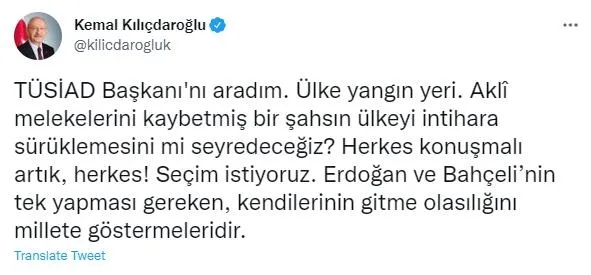 "TÜSİAD Başkanı'nı aradım. Ülke yangın yeri. Aklî melekelerini kaybetmiş bir şahsın ülkeyi intihara sürüklemesini mi seyredeceğiz? Herkes konuşmalı artık, herkes! Seçim istiyoruz. Erdoğan ve Bahçeli'nin tek yapması gereken, kendilerinin gitme olasılığını millete göstermeleridir.