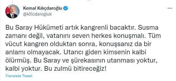 Bu Saray Hükümeti artık kangrenli bacaktır. Susma zamanı değil, vatanını seven herkes konuşmalı. Tüm vücut kangren olduktan sonra, konuşsanız da bir anlamı olmayacak. Utancı giden kimsenin kalbi ölürmüş. Bu Saray ve şürekasının utanması yoktur, kalbi yoktur. Bu zulmü bitireceğiz!"