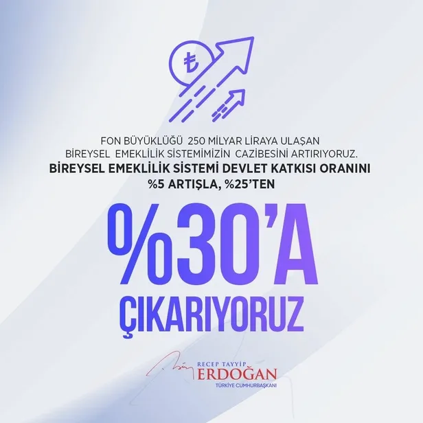 "BES ile ilgili de bir müjdemiz var… Fon büyüklüğü 250 milyar liraya ulaşan bireysel emeklilik sistemimizin cazibesini artırmak için devlet katkısı oranını %5 daha artırarak %30'a çıkartıyoruz..."