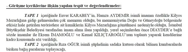 DİAYDER iddianamesinde dikkat çeken ayrıntılar yer aldı. İstanbul Cumhuriyet Başsavcılığı'nın 23 şüpheli hakkında hazırladığı iddianamede şüphelilerden Enver Karabey'in, DİAYDER adlı oluşumda yer aldığı, aynı zamanda Demokratik Kent Konseyi adlı KCK/TM yapılanmasında da delege olarak görev yaptığı belirtildi. İddianamede Karabey'in, H.A. isimli imamın özellikle Kilyos Mezarlığına gidip gelmesinden çok memnun olduğu, bu memnuniyetin, Doğu ve Güneydoğu bölgesinde etkisiz hale getirilen teröristlere ait kemiklerin Kilyos Mezarlığına gömülmesi nedeniyle olduğu ifade edildi. İddianamede ayrıca, "İBB tarafından imam alımı ilanı yapıldığı, yerel seçimlerden önce DİAYDER'e bağlı sözde imamlar ile İmamoğlu ve Kılıçdaroğlu'nun toplantı yaptığı, kendilerine kadro konusunda söz verildiği" tespitlerine yer verildi.