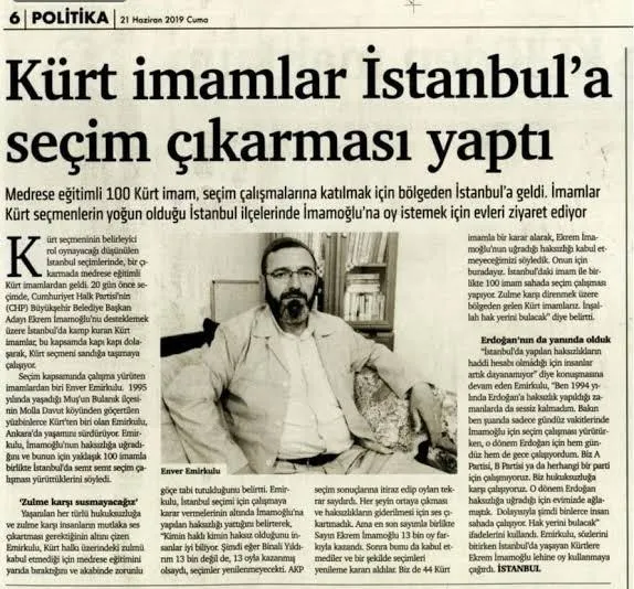 Terör örgütü PKK'ya yakınlığıyla bilinen Yeni Yaşam Gazetesi'nin 21 Haziran 2019 tarihli haberine göre, 100 Kürt imam, 2019 İstanbul Yerel Seçimleri kapsamında CHP'li Ekrem İmamoğlu'na oy toplamak için çalışma yürüttü.