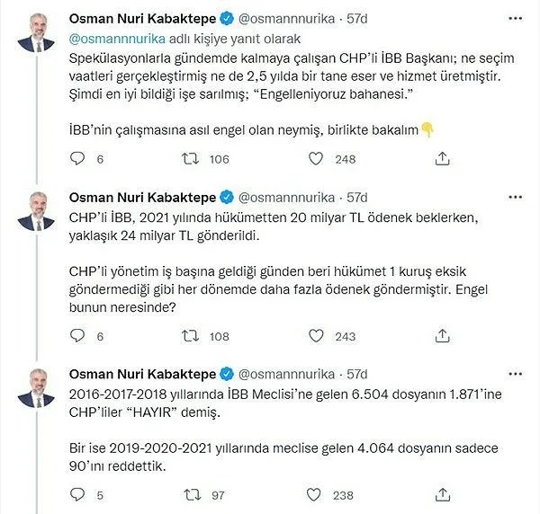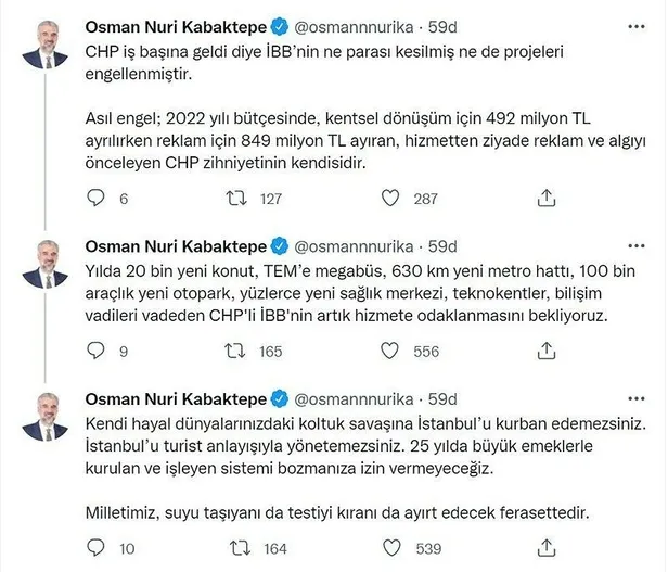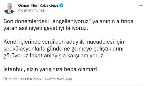 İmamoğlu'nun iddialarına AK Parti İstanbul İl Başkanı Osman Nuri Kabaktepe, Twitter hesabından yaptığı paylaşımlarla tepki gösterdi.