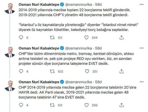 - 2014-2019 yıllarında meclise toplam 22 borçlanma teklifi gönderdik. 2019-2021 yıllarında CHP'li yönetim 48 borçlanma teklifi gönderdi. 'İstanbul'u öz kaynaklarıyla yöneteceğiz' diyenler 'İstanbul nimet nimet' diyerek öz kaynakları tükettiler, belediyeyi borç batağına sapladılar.