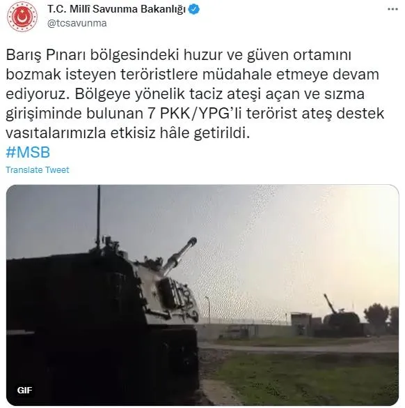 Barış Pınarı bölgesindeki huzur ve güven ortamını bozmak isteyen teröristlere müdahale etmeye devam ediyoruz. Bölgeye yönelik taciz ateşi açan ve sızma girişiminde bulunan 7 PKK/YPG'li terörist ateş destek vasıtalarımızla etkisiz hâle getirildi.
