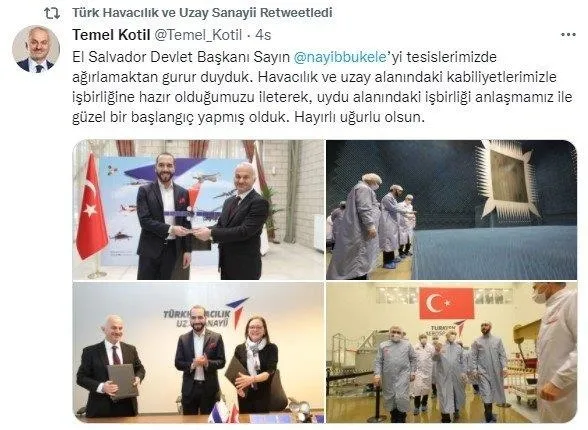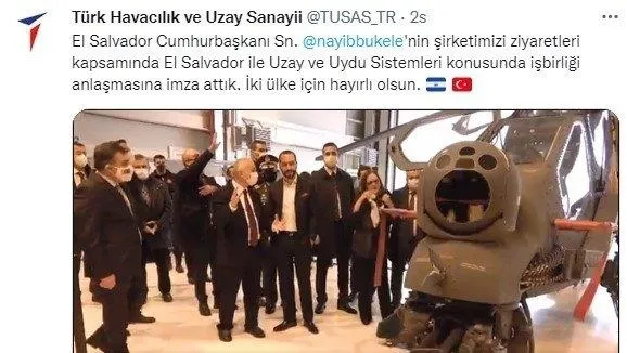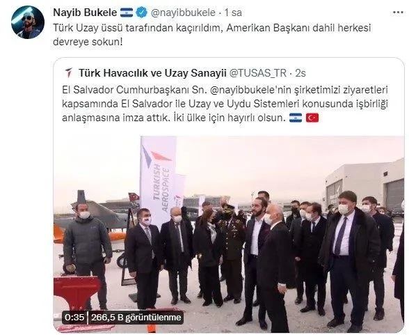 Bukele son olarak Türk Uzay Üssü'ne yaptığı ziyaretle ilgili paylaşımında "Türk Uzay üssü tarafından kaçırıldım, Amerikan Başkanı dahil herkesi devreye sokun!" dedi.