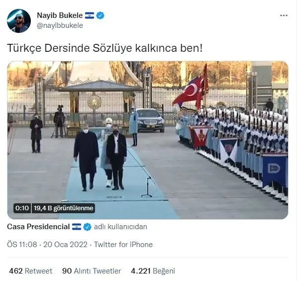 Bukele, resmi karşılamanın ardından 'Merhaba asker' diyerek tören kıtasını selamlamıştı. O anlarla ilgili ilgili yaptığı paylaşımda da "Türkçe Dersinde Sözlüye kalkınca ben!" ifadelerine yer verdi.