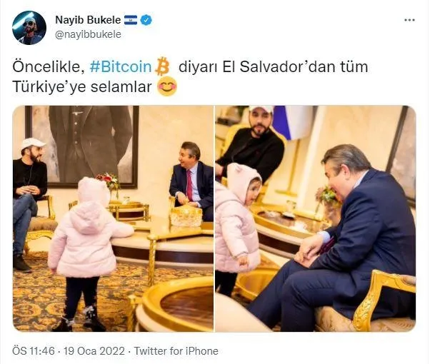 Bitcoin'i resmi para birimi olarak kullanan El Salvador'un Devlet Başkanı Bukele, paylaşımında, "Öncelikle, #Bitcoin diyarı El Salvador'dan tüm Türkiye'ye selamlar" ifadesini kullandı.