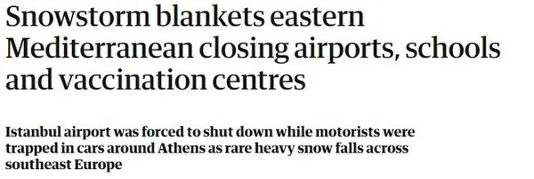 Guardian ise haberin başlığında Doğu Akdeniz'deki kar fırtınasına vurgu yaptı. Haberin açıklamasında ise İstanbul Havalimanı'nın uçuşlara kapatıldığından bahsedildi. Ayrıca haberde, İstanbul Havalimanı'nın ilk defa kapatıldığına da dikkat çekildi.