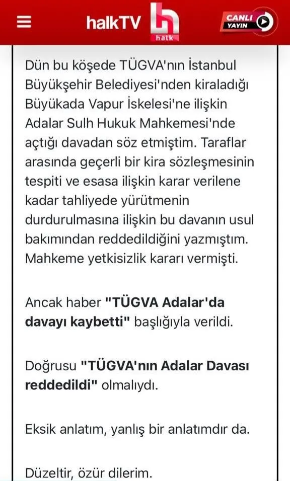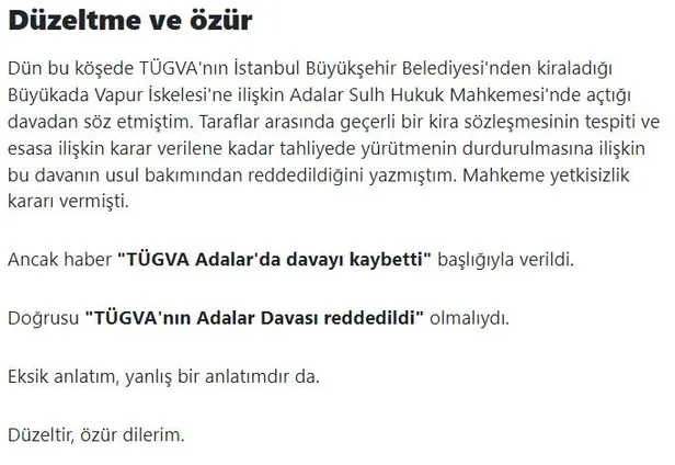 Yalanı ortaya çıkınca çark etmek zorunda kalan İsmail Saymaz, bugünkü yazısında özür dilemek zorunda kaldı. Saymaz, köşesinde konuya ilişkin bir metin yayınlayarak "Dün bu köşede TÜGVA'nın İstanbul Büyükşehir Belediyesi'nden kiraladığı Büyükada Vapur İskelesi'ne ilişkin Adalar Sulh Hukuk Mahkemesi'nde açtığı davadan söz etmiştim. Taraflar arasında geçerli bir kira sözleşmesinin tespiti ve esasa ilişkin karar verilene kadar tahliyede yürütmenin durdurulmasına ilişkin bu davanın usul bakımından reddedildiğini yazmıştım. Mahkeme yetkisizlik kararı vermişti. Ancak haber "TÜGVA Adalar'da davayı kaybetti" başlığıyla verildi. Doğrusu "TÜGVA'nın Adalar Davası reddedildi" olmalıydı. Eksik anlatım, yanlış bir anlatımdır da. Düzeltir, özür dilerim." dedi.