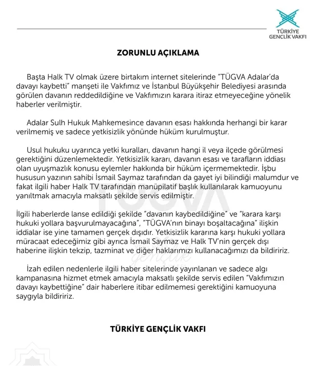"Adalar Sulh Hukuk Mahkemesince davanın esası hakkında herhangi bir karar verilmemiş ve sadece yetkisizlik yönünde hüküm kurulmuştur. Usul hukuku uyarınca yetki kuralları, davanın hangi il veya ilçede görülmesi gerektiğini düzenlemektedir. Yetkisizlik kararı, davanın esası ve tarafların iddiası olan uyuşmazlık konusu eylemler hakkında bir hüküm içermemektedir. İşbu hususun yazının sahibi İsmail Saymaz tarafından da gayet iyi bilindiği malumdur ve fakat ilgili haber Halk TV tarafından manipülatif başlık kullanılarak kamuoyunu yanıltmak amacıyla maksatlı şekilde servis edilmiştir. İlgili haberlerde lanse edildiği şekilde 'davanın kaybedildiğine' ve 'karara karşı hukuki yollara başvurulmayacağına' ve 'TÜGVA'nın binayı boşaltacağına' ilişkin iddialar ise yine tamamen gerçek dışıdır."