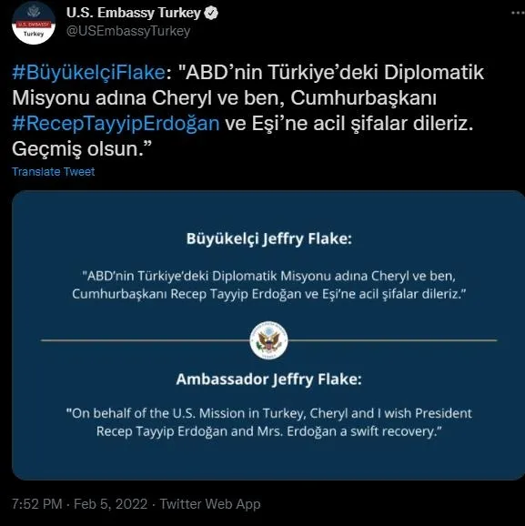 ABD Büyükelçisi Flake, ''Cumhurbaşkanı Erdoğan ve eşine acil şifalar dileriz'' dedi. Mesajda "ABD'nin Türkiye'deki Diplomatik Misyonu adına Cheryl ve ben, Cumhurbaşkanı #RecepTayyipErdoğan ve Eşi'ne acil şifalar dileriz. Geçmiş olsun." ifadlerine yer verildi.