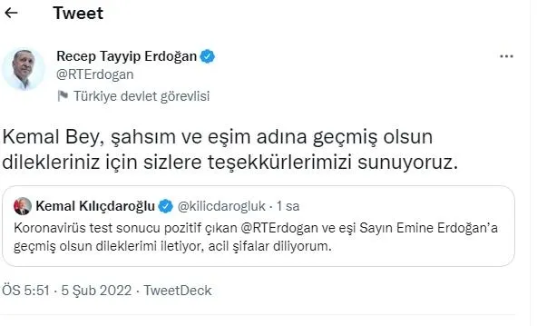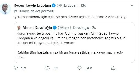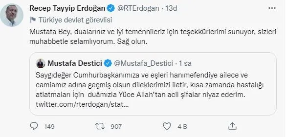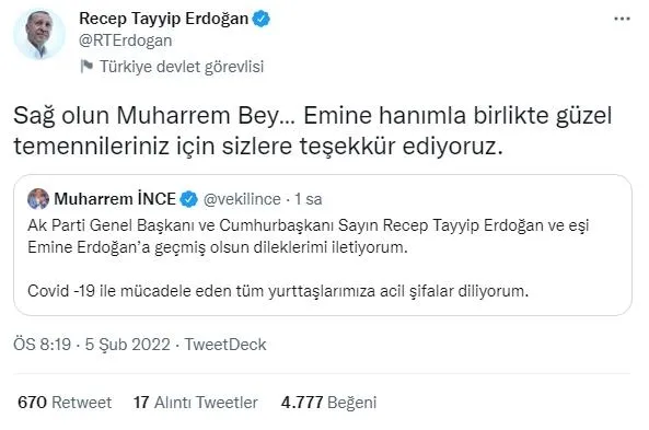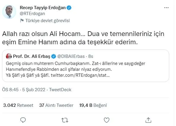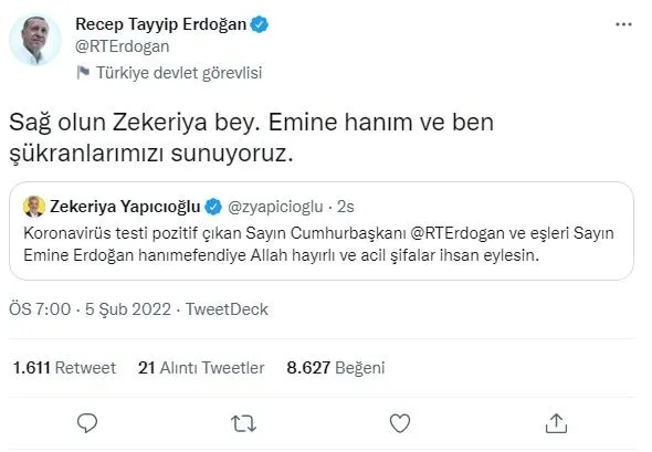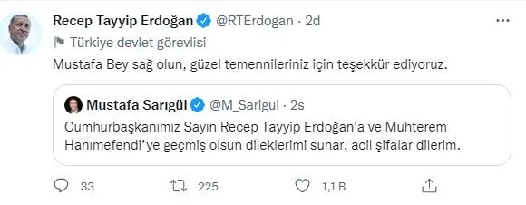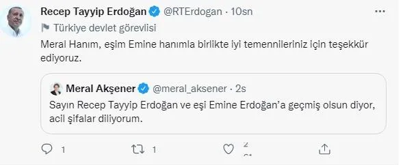 Cumhurbaşkanı Erdoğan, Twitter hesabından yaptığı paylaşımda, "Ülkemizin dört bir yanında görev yapan belediye başkanlarımıza, valilerimize, kaymakamlarımıza, muhtarlarımıza iletmiş oldukları 'geçmiş olsun' mesajlarından dolayı eşim Emine Hanım ve şahsım adına teşekkür ediyorum." ifadesini kullandı.