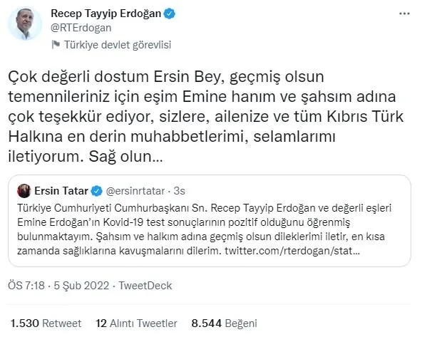 Çok değerli dostum Ersin Bey, geçmiş olsun temennileriniz için eşim Emine hanım ve şahsım adına çok teşekkür ediyor, sizlere, ailenize ve tüm Kıbrıs Türk Halkına en derin muhabbetlerimi, selamlarımı iletiyorum. Sağ olun…