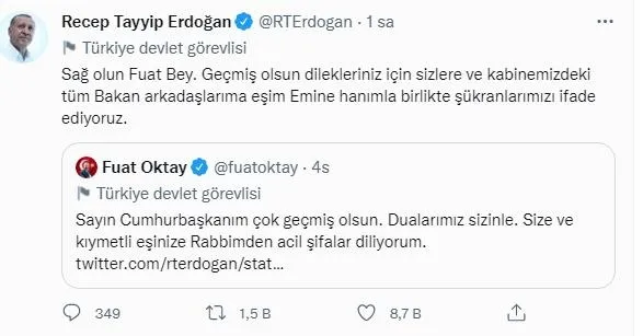 Cumhurbaşkanı Yardımcısı Fuat Oktay, Kovid-19 testi pozitif çıkan Başkan Recep Tayyip Erdoğan ve eşi Emine Erdoğan için geçmiş olsun mesajı yayımladı.