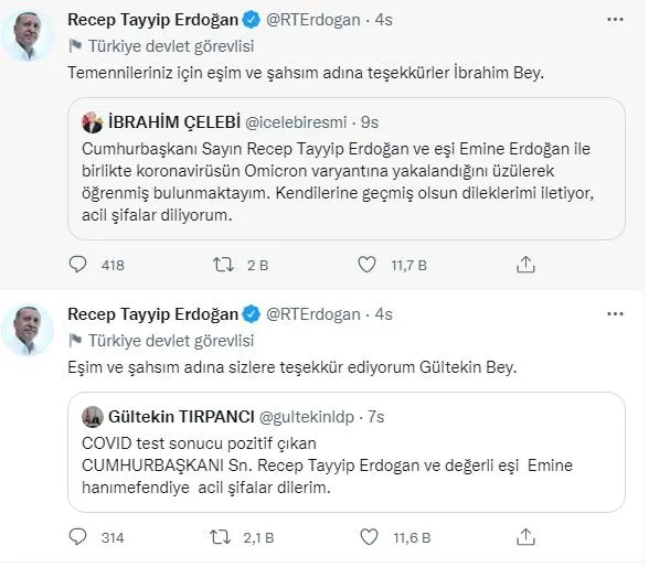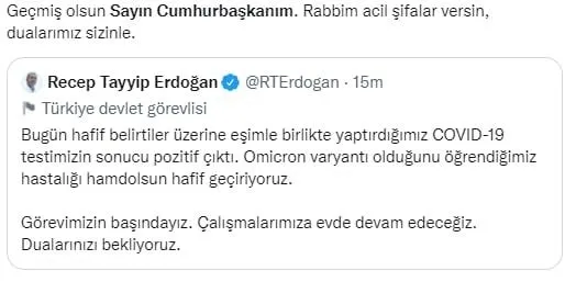 Son dakika haberi! Başkan Recep Tayyip Erdoğan, sosyal medyadan yaptığı açıklamada, eşi Emine Erdoğan ile yaptırdıkları Kovid-19 testinin pozitif çıktığını duyurdu. Başkan Erdoğan, açıklamasında, "Omicron varyantı olduğunu öğrendiğimiz hastalığı hamdolsun hafif geçiriyoruz. Görevimizin başındayız. Çalışmalarımıza evde devam edeceğiz. Dualarınızı bekliyoruz." ifadelerine yer verdi. Sosyal medyadan 'geçmiş olsun' mesajları yağarken Başkan Erdoğan başta muhalefet liderleri olmak üzere siyasi isimlere tek tek teşekkür etti.