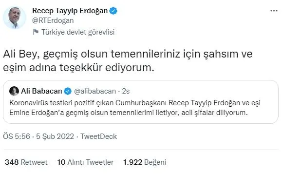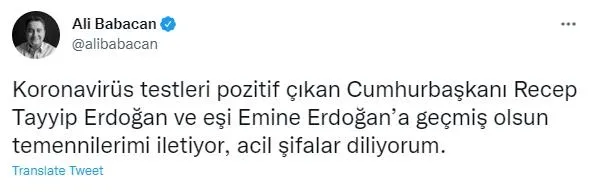 DEVA Partisi Genel Başkanı Ali Babacan Twitter'dan yaptığı açıklamada, "Koronavirüs testleri pozitif çıkan Cumhurbaşkanı Recep Tayyip Erdoğan ve eşi Emine Erdoğan'a geçmiş olsun temennilerimi iletiyor, acil şifalar diliyorum" dedi.