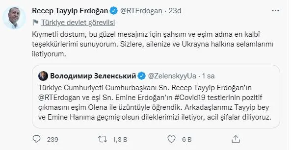 Kıymetli dostum, bu güzel mesajınız için şahsım ve eşim adına en kalbî teşekkürlerimi sunuyorum. Sizlere, ailenize ve Ukrayna halkına selamlarımı iletiyorum.