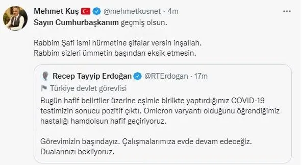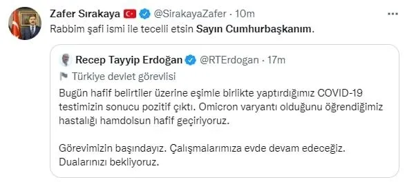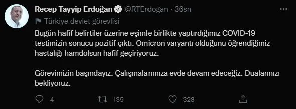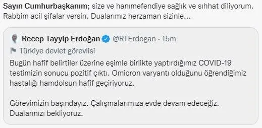 Omicron varyantı olduğunu öğrendiğimiz hastalığı hamdolsun hafif geçiriyoruz. Görevimizin başındayız. Çalışmalarımıza evde devam edeceğiz. Dualarınızı bekliyoruz" diye konuştu.