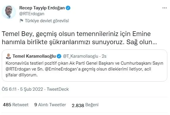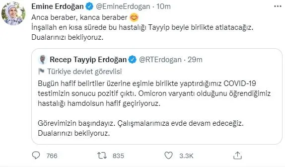 Erdoğan, eşi Emine Erdoğan ile Kovid 19 test sonuçların pozitif çıktığını açıklamıştı. Emine Erdoğan da sosyal medya hesabı üzerinden açıklamada bulundu.