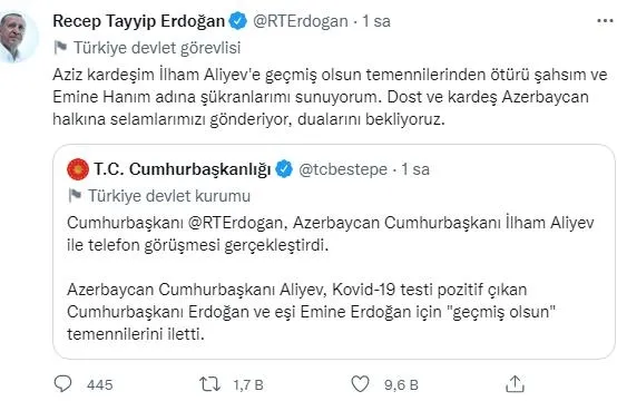 Aziz kardeşim İlham Aliyev'e geçmiş olsun temennilerinden ötürü şahsım ve Emine Hanım adına şükranlarımı sunuyorum. Dost ve kardeş Azerbaycan halkına selamlarımızı gönderiyor, dualarını bekliyoruz.