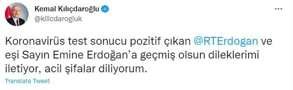CHP Genel Başkanı Kılıçdaroğlu, koronavirüs test sonucu pozitif çıkan Cumhurbaşkanı Erdoğan ve eşi Emine Erdoğan'a "geçmiş olsun" dileğinde bulundu.