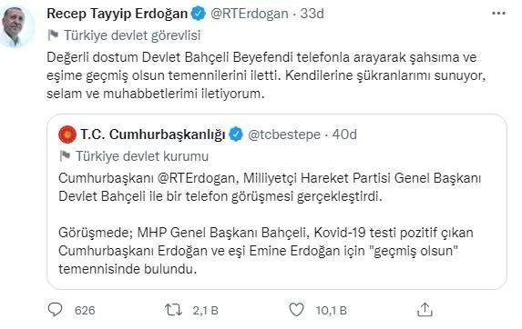 MHP Genel Başkanı Devlet Bahçeli, Kovid-19 testi pozitif çıkan Cumhurbaşkanı Recep Tayyip Erdoğan ve eşi Emine Erdoğan için "geçmiş olsun" dileğinde bulundu.