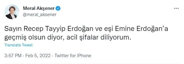Akşener: Sayın Recep Tayyip Erdoğan ve eşi Emine Erdoğan'a geçmiş olsun diyor, acil şifalar diliyorum.