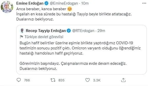 "Kovid-19 PCR testleri pozitif çıkan Cumhurbaşkanımız Sayın Recep Tayyip Erdoğan ve değerli eşi Sayın Emine Erdoğan Hanımefendiye geçmiş olsun dileklerimizi iletiyoruz."