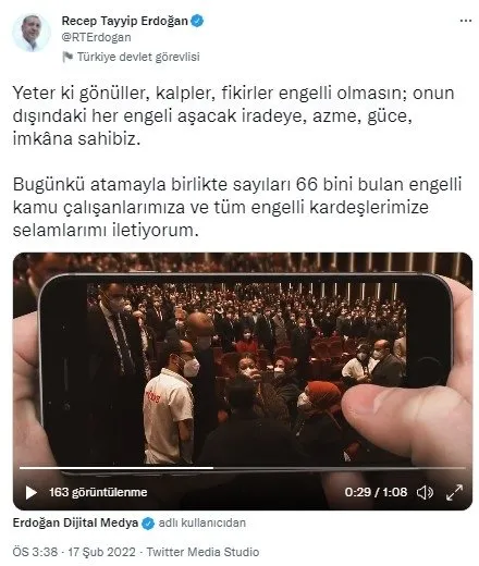Bugün atamasını yapacağımız 2927 engelli kardeşimize işlerinin hayırlı olmasını diliyorum. Kamudaki engelli memur sayımız 66 bine ulaşmış oluyor. Göreve geldiğimizde kamuda sadece 5 bin 777 engelli memur vardı. Kamudaki engelli işçi sayısı da bu süreçte 127 bine yaklaştı. Son 9 yılda kamuda istihdam edilen sayısı 192 bin sınırına dayandı.