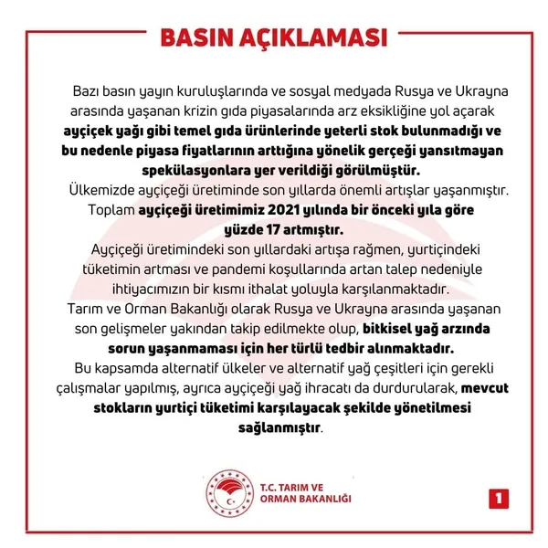 Tarım ve Orman Bakanı Vahit Kirişci "Ayçiçek yağı gibi temel gıda ürünlerinde yeterli stok bulunmadığı yönünde paylaşılan bilgiler doğru değildir. Gerekli tedbirler alınmıştır. Ülkemizin yeterli miktarda ayçiçek yağı stoku bulunmaktadır" ifadelerini kullandı. İşte bakanlık tarafından yapılan basın açıklaması: