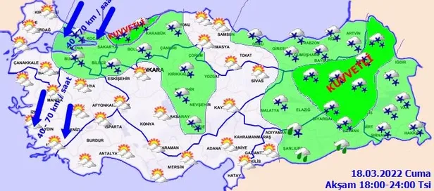 Genellikle kuzeyli, güneydoğu kesimlerde güneyli yönlerden hafif, ara sıra orta kuvvette, Marmara, Kıyı Ege ile Batı Akdeniz'de kuvvetli ve kısa süreli fırtına şeklinde (40-70 km/sa) eseceği tahmin ediliyor.