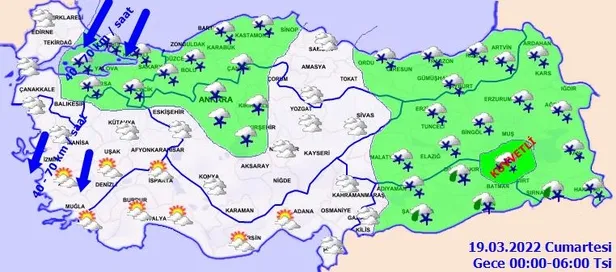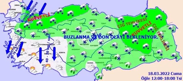 Meteoroloji Genel Müdürlüğü tarafından yapılan son değerlendirmelere göre: Ülkemiz genelinin parçalı ve çok bulutlu, Marmara'nın doğusu, İç Anadolu, Karadeniz, Doğu ve Güney Anadolu ile Kırklareli'nin kıyı kesimleri, Çanakkale'nin iç kesimleri, Kütahya, Afyonkarahisar, Mersin, Adana'nın kuzey ve batısı, K. Maraş, Osmaniye ve Hatay çevrelerinin aralıklı yağışlı geçeceği tahmin ediliyor. Genellikle karla karışık yağmur ve kar, Doğu Akdeniz kıyıları ve Güneydoğu Anadolu'nun güneybatısında yağmur ve sağanak şeklinde görülmesi beklenen yağışların gece saatlerinde Trabzon'un doğusu ile Rize ve Hopa çevrelerinde, yarın Marmara'nın doğusu, Batı Karadeniz, Orta Karadeniz kıyıları, Doğu Karadeniz, Doğu Anadolu'nun kuzeyi, İstanbul, Elazığ, Bingöl, Bitlis, Muş çevreleri ile Diyarbakır ve Batman'ın kuzey ve doğu kesimlerinde yerel olarak kuvvetli ve yoğun kar şeklinde olacağı tahmin ediliyor. Karadeniz'in iç ve yüksek kesimleri ile Doğu Anadolu'da yüksek kar örtüsüne sahip eğimli bölgelerde çığ riski bulunmaktadır. Kuzey, iç ve doğu kesimlerde buzlanma ve don olayı bekleniyor.