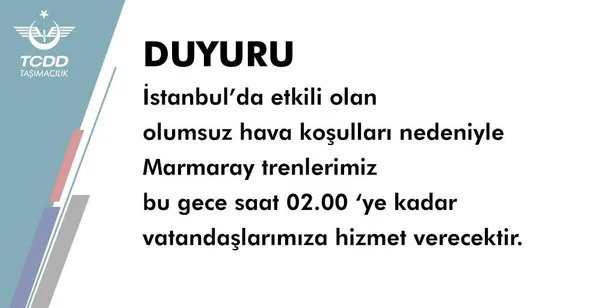 TCDD Taşımacılık, "İstanbul'da etkili olan olumsuz hava koşulları nedeniyle Marmaray trenlerimiz bu gece saat 02.00'ye kadar vatandaşlarımıza hizmet verecektir." ifadelerini kullandı.