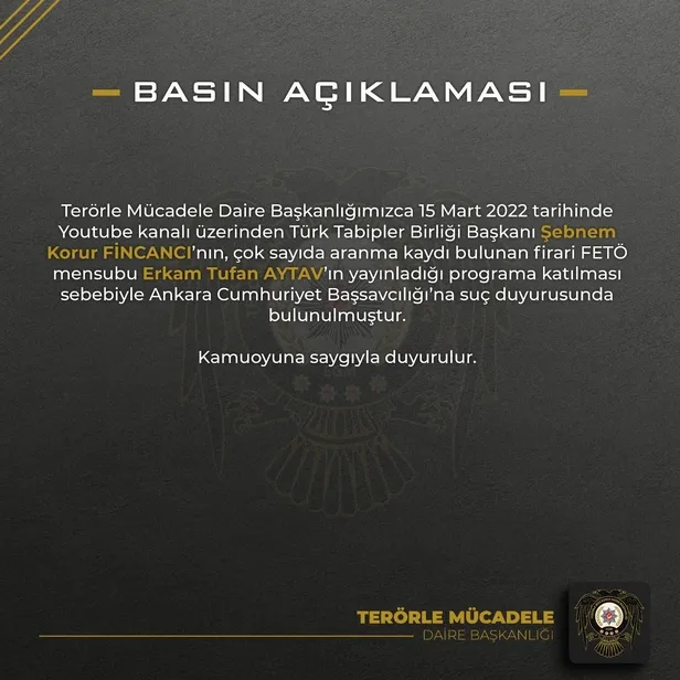 TEM Daire Başkanlığı'nın Twitter'daki hesabından yapılan açıklamada, "TEM Daire Başkanlığımızca 15 Mart 2022 tarihinde Youtube kanalı üzerinden TTB Başkanı Şebnem Korur Fincancı'nın, çok sayıda aranma kaydı bulunan firari FETÖ mensubu Erkam Tufan Aytav'ın yayımladığı programa katılması sebebiyle Ankara Cumhuriyet Başsavcılığı'na suç duyurusunda bulunulmuştur" denildi.