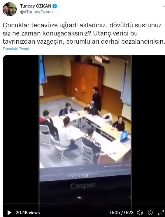 CHP İzmir Milletvekili Tuncay Özkan, sosyal medyadan yaptığı pişkin paylaşımda "Çocuklar tecavüze uğradı akladınız, dövüldü sustunuz siz ne zaman konuşacaksınız? Utanç verici bu tavrınızdan vazgeçin, sorumluları derhal cezalandırılsın." ifadeleriyle hedef şaşırtmaya çalıştı.