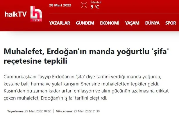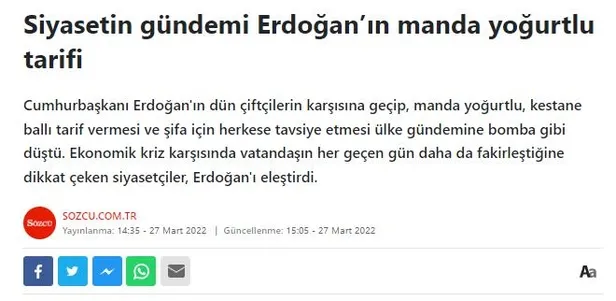 Başkan Erdoğan, her akşam yatmadan yediği karışımı tavsiye ederek, "Manda yoğurdu hakikaten kalitedir. İçine şöyle Medine hurması doğrarım, çay kaşığı kestane balı ve yulaf ezmesi atarım. Bunu yer yatarım, şifa..." demişti.