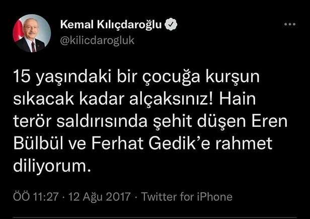 Vatandaşlar, CHP Genel Başkanı Kemal Kılıçdaroğlu'nun şehit Eren'in ölüm yıldönümlerinde attığı tweetlere değinerek, "Kılıçdaroğlu '15 yaşındaki bir çocuğa kurşun sıkacak kadar alçaksınız, Hain terör saldırısında şehit düşen Eren Bülbül ve Ferhat Gedik'e rahmet diliyorum' diye tweet atarken CHP'li Meclis üyelerinin Eren Bülbül hakkındaki bu davranışını anlamak mümkün değil" dedi. Vatandaşların tepkileri şöyle: