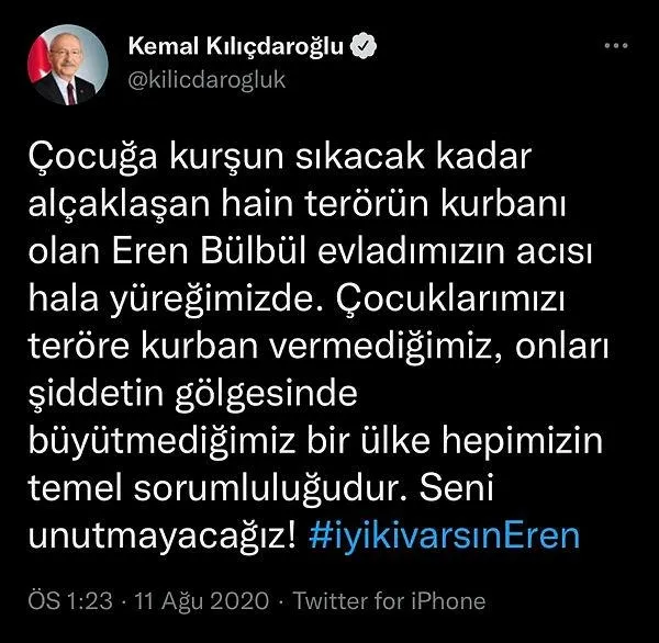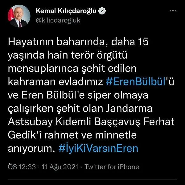 Emrah Çoban (28): "15 yaşındaki şehidimiz Eren Bülbül'e her yıl anma paylaşımında bulunan Kemal Kılıçdaroğlu, acaba bu konuda içtenlikle mi tweet atıyor. Meclis üyelerinin davranışları gösteriyor ki farklı anlayış içerisindeler.