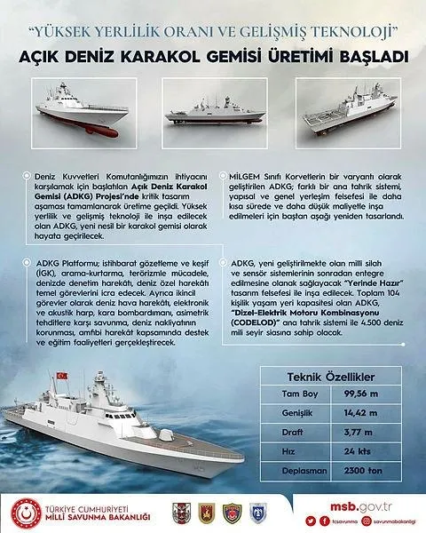 Deniz Kuvvetleri Komutanlığı için yüksek yerlilik ve gelişmiş teknolojiyle inşa edilecek açık deniz karakol gemisinin (ADKG) üretimine geçildi. Uzunluğu 99,56 metre olan ADKG platformu, istihbarat gözetleme ve keşif, arama-kurtarma, terörle mücadele, denizde denetim harekatı ve deniz özel harekatı temel görevlerini yapacak.