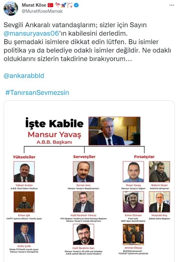 Murat Köse, söz konusu paylaşımlarda Ankara Büyükşehir Belediyesi'nin "Yükselciler", "Servetçiler" ve "Fırsatçılar" olarak tanımladığı üç grup tarafından yönetildiğini savundu.