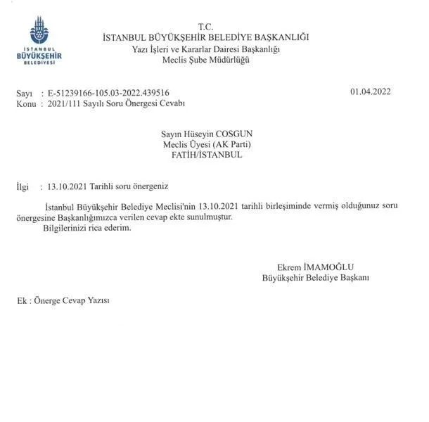 Osmanlı'nın fetih öncesi ilk şehitlerinin yattığı Şehitlik Mezarlığı ve Naif Baba Tekkesi arazisi içerisinde bulunan tarihi köşkü kendisine tahsis ederek Ağustos 2021 tarihi itibariyle ikametgah olarak kullanan İBB Başkanı Ekrem İmamoğlu, mecliste verilen soru önergelerine cevap verilmemesi tepkileri üzerine Sarıyer'den İBB Meclis Üyesi olan Hüseyin Çoşgun'un Ocak ayındaki soru önergesine Başkanlık makamı olarak yanıt gönderdi.