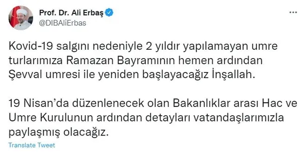 Erbaş, sosyal medya hesabından yaptığı açıklamada, "Kovid-19 salgını nedeniyle 2 yıldır yapılamayan umre turlarımıza Ramazan Bayramı'nın hemen ardından şevval umresi ile yeniden başlayacağız. 19 Nisan'da düzenlenecek Bakanlıklar Arası Hac ve Umre Kurulunun ardından detayları vatandaşlarımızla paylaşacağız." ifadelerini bildirdi.