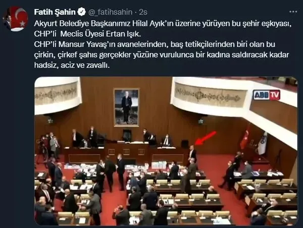 AK Parti Genel Sekreteri Fatih Şahin, Işık'ın Mansur Yavaş'ın baş tetikçilerinden biri olduğunu ifade ederek "Akyurt Belediye Başkanımız Hilal Ayık'ın üzerine yürüyen bu şehir eşkıyası, CHP'li Meclis Üyesi Ertan Işık. CHP'li Mansur Yavaş'ın avanelerinden, baş tetikçilerinden biri olan bu çirkin, çirkef şahıs gerçekler yüzüne vurulunca bir kadına saldıracak kadar hadsiz, aciz ve zavallı" dedi.