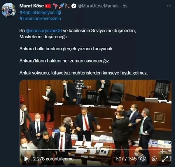 Ankara Büyükşehir Belediye Meclisi Ak Parti Grup Başkan Vekili Murat Köse yaşanan çirkin olaya "Mansur Yavaş ve kabilesinin seviyesine düşmeden, maskelerini düşüreceğiz. Ankara halkı bunların gerçek yüzünü tanıyacak. Ankara'lıların hakkını her zaman savunacağız. Ahlak yoksunu, kifayetsiz muhterislerden kimseye fayda gelmez." sözleriyle tepki gösterdi.