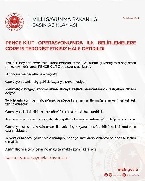 "Birinci aşama hedefleri ele geçirildi. Operasyon planlandığı şekilde başarıyla devam ediyor. Mehmetçik bölgeyi kontrol altına almaya başladı. Arama-tarama faaliyetleri devam ediyor. Teröristlerin tüm barınak, sığınak ve sözde karargahları ile mağaraları ve inleri tek tek tahrip edilecek. Operasyonda ilk belirlemelere göre 19 terörist etkisiz hale getirildi. Arama-tarama sırasında yapılacak tespitlerle bu sayının artacağını değerlendiriyoruz. Operasyon sırasında 4 kahraman silah arkadaşımız yaralandı. Gerekli tüm tıbbi müdahale yapılmaktadır.