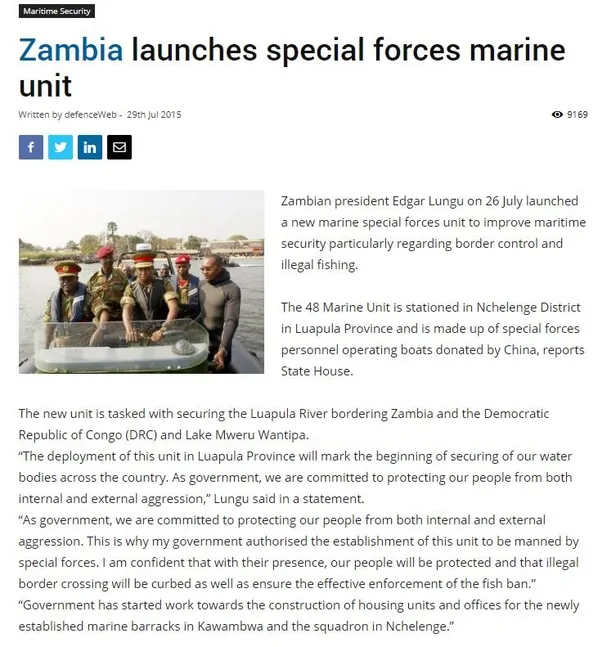 Öte yandan Zambiya'nın iç deniz denilen nehir alanında komşularıyla da sınır anlaşmazlıkları bulunmakta. Ülkenin adı da Zambezi Nehri'nden geldiği biliniyor. Aydınlık'ta yer alan bilgiye göre 2015'te bölgenin güvenliğini sağlamak için özel bir "deniz piyade birliği (marine)" gücü kuruldu.