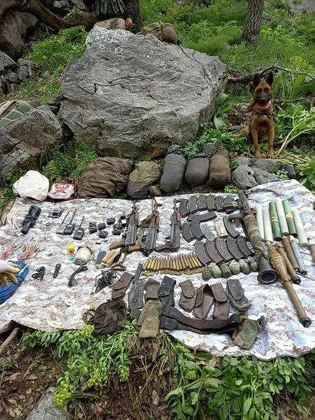 Aramada kayalıklar arasında bidon içinde 3 kalaşnikof piyade tüfeği, 17 kalaşnikof piyade tüfeği şarjörü, bir el yapımı patlayıcı (EYP), bir RPG-7 roketatar, bir RPG-7 roketatara ait anti tank mühimmatı, 3 RPG-7 roketatara ait anti personel mühimmatı, bir RPG-7 roketatara ait anti tank sevk fişeği, 6 RPG-7 roketatara ait anti personel sevk fişeği, 6 el bombası, 3 el telsizi, bir gece görüş cihazı, bir aksiyon kamerası, 500 gram C4 patlayıcı, 500 gram C3 patlayıcı, 92 elektrikli fünye, 12 mekanik fünye, 150 metre infilaklı fitil, 54 fişek, 7 EYP alıcısı, bir telsiz şarj cihazı, 2 telsiz bataryası, 10 şarjör kütüklüğü ele geçirildi.