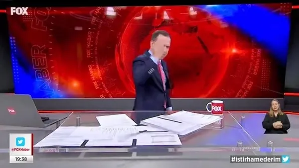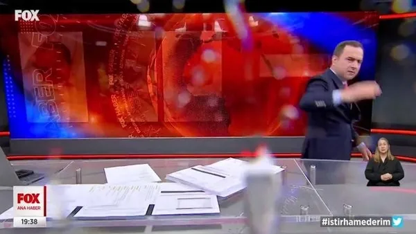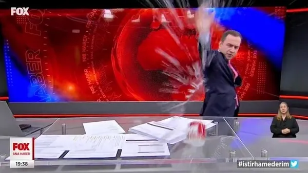 FOX Haber Sunucusu Selçuk Tepeli canlı yayında bir anda kameraya bağırıp çağırmaya başlamış. Ardından da elindeki kalemi kameraya doğru fırlatıp, masadaki su dolu bardağı da kırarak yayınını terk etmiş...