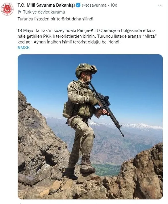Bakanlıktan yapılan açıklamada, "Turuncu listeden bir terörist daha silindi. 18 Mayıs'ta Irak'ın kuzeyindeki Pençe- Kilit Operasyon bölgesinde etkisiz hale getirilen PKK'lı teröristlerden birinin, turuncu listede aranan 'Mirza' kod adlı Ayhan İnalhan isimli terörist olduğu belirlendi" denildi.