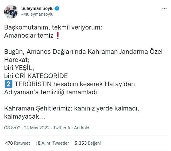 Soylu paylaşımında "Başkomutanım, tekmil veriyorum: Amanoslar temiz. Bugün, Amanos Dağları'nda Kahraman Jandarma Özel Harekat biri yeşil, biri gri kategoride 2 teröristin hesabını keserek Hatay'dan Adıyaman'a temizliği tamamladı. Kahraman Şehitlerimiz; kanınız yerde kalmadı, kalmayacak" ifadelerini kullandı.